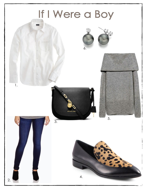 1. My Hubby’s White Shirt 2. Maternity Jeans(Amanda Style), Thyme Maternity 3. Crossbody Bag, Michael Kors 4. Leopard Loafers, Prada 5. Off-Shoulder Sweater, Zara 6. Black Pearl Earrings