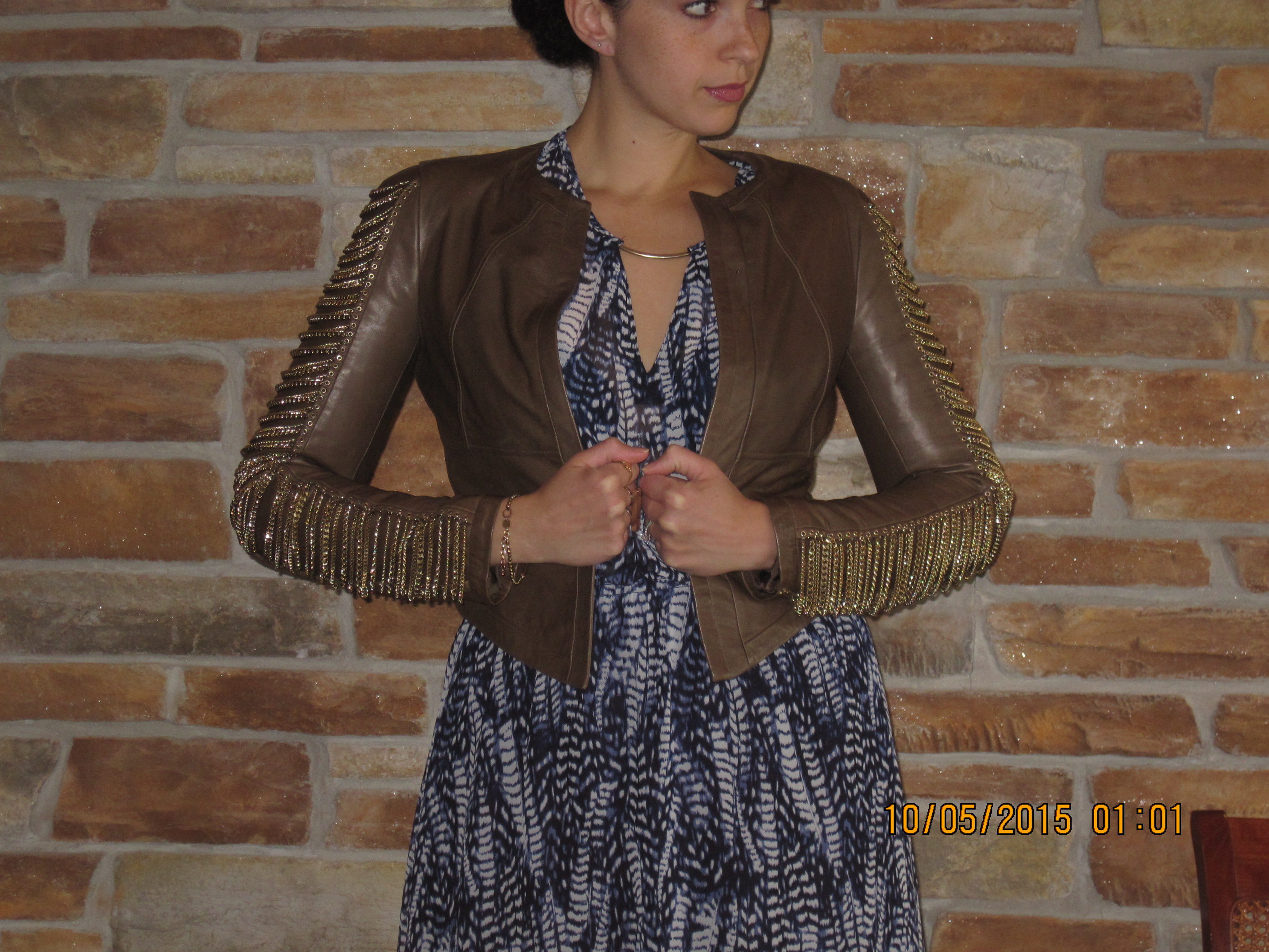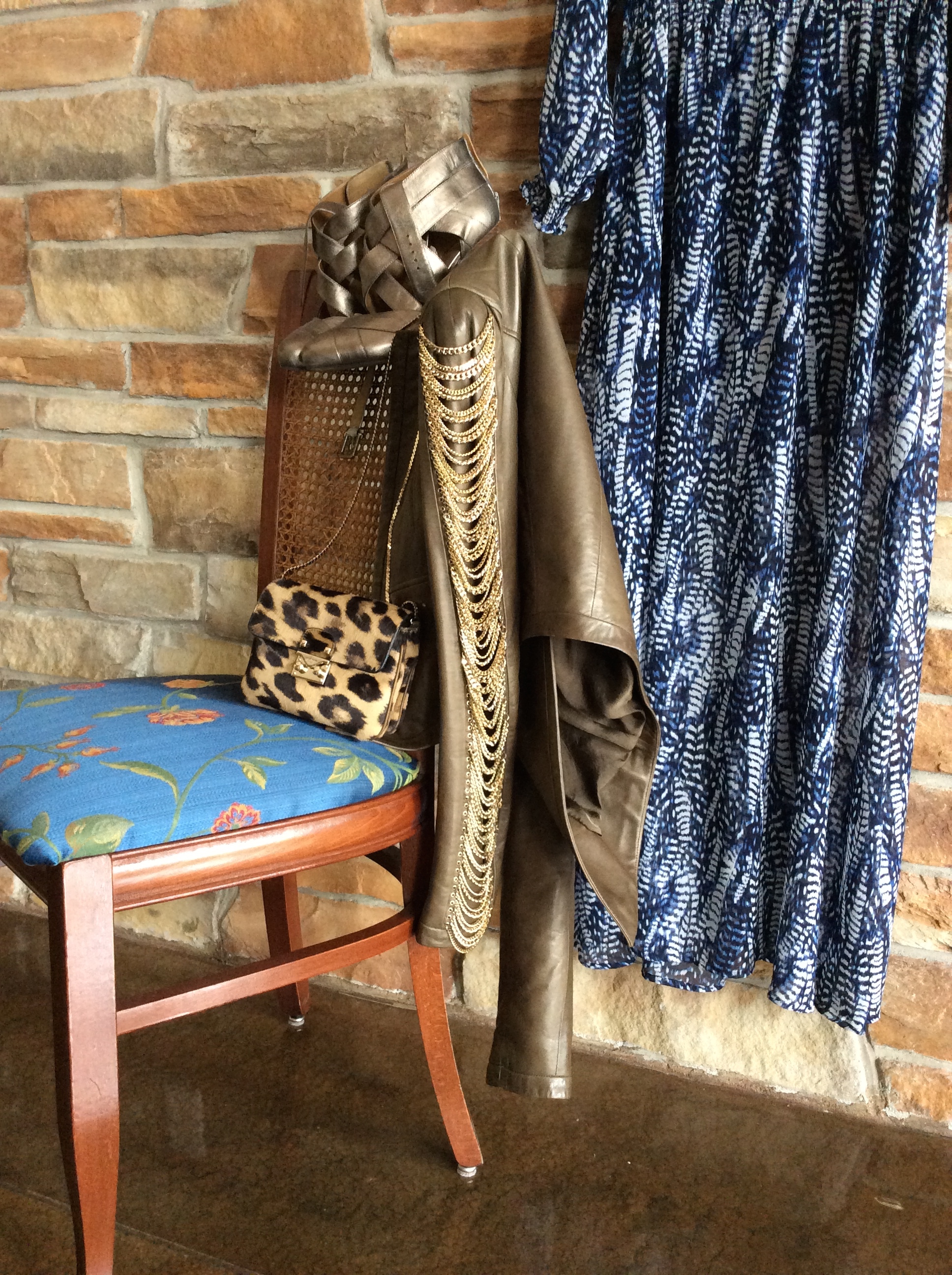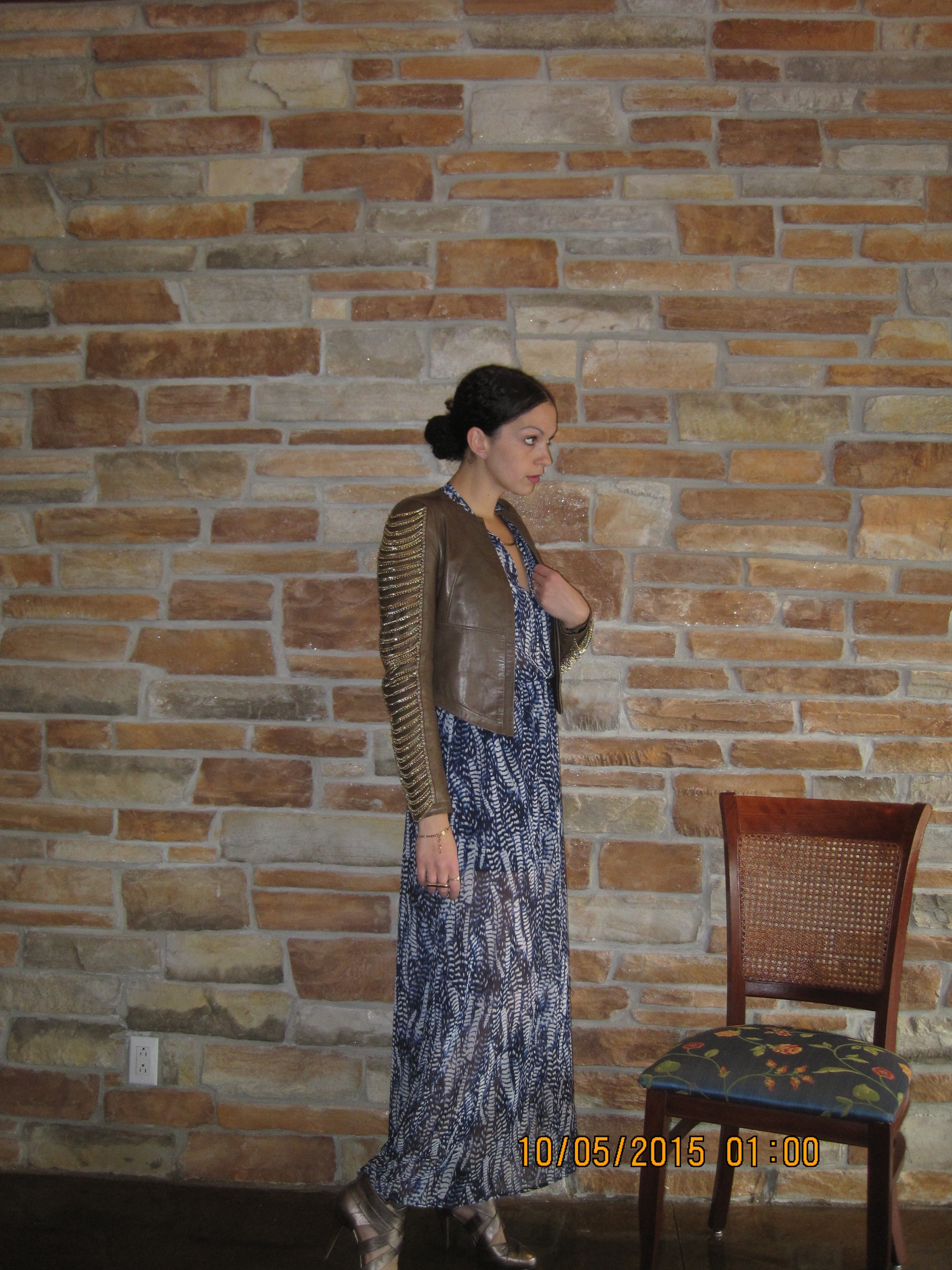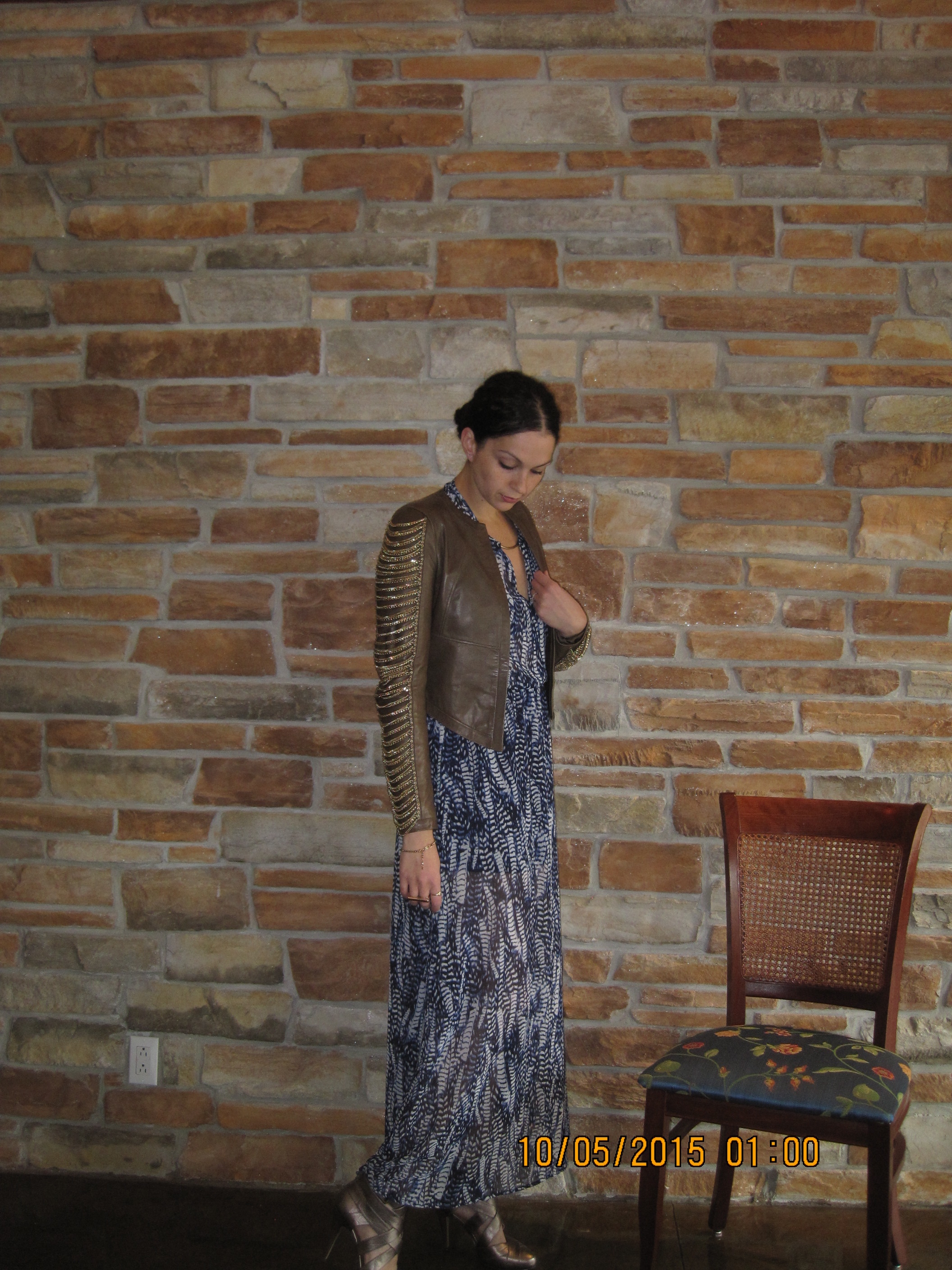 Since the crisp Fall air has commenced and your not sure about open toes anymore, finding the perfect outfit that isn’t still in summer mode, but not quite yet in Fall coat mode can be a bit of a challenge. I find you can make great wear of your lighter weight, even chiffon dresses, by pairing it with a leather blazer or cropped jacket. You feel feminine and flirty in a flowy maxi dress, but still rocker-chic and up-to-season with a leather top jacket. You can still pair it with a caged or peep toe shoe, or slip on a closed pump if you feel too cold to expose your toesies 🙂 It is the perfect transition into Fall, and you get longer wear out of dresses that you think are done for the year. Here is my pick for this evening…Oh, and our little secret: They are all pieces I have had in my closet a couple of seasons already. No need to go out and spend money all the time. Especially after you’ve been pregnant and haven’t worn them for at least nine months, things start to feel brand new again… And never be afraid to mix prints 🙂