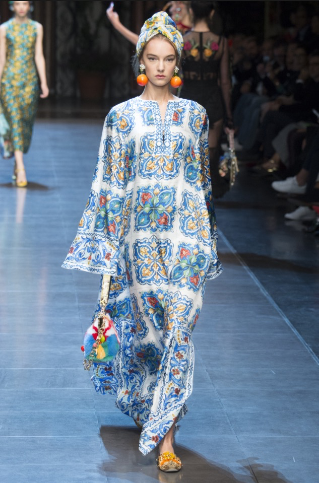 Splashed embroideries of Pisa and Rome across beaded gowns and the models donned caftans and held purses that looked like the ceramics of the Amalfi coast. Their trademark Sicilian siren look of black lace, red roses, and romantic prints was still very evident throughout the show as well. It was colourful, symbolic, and fun, while still making a statement.