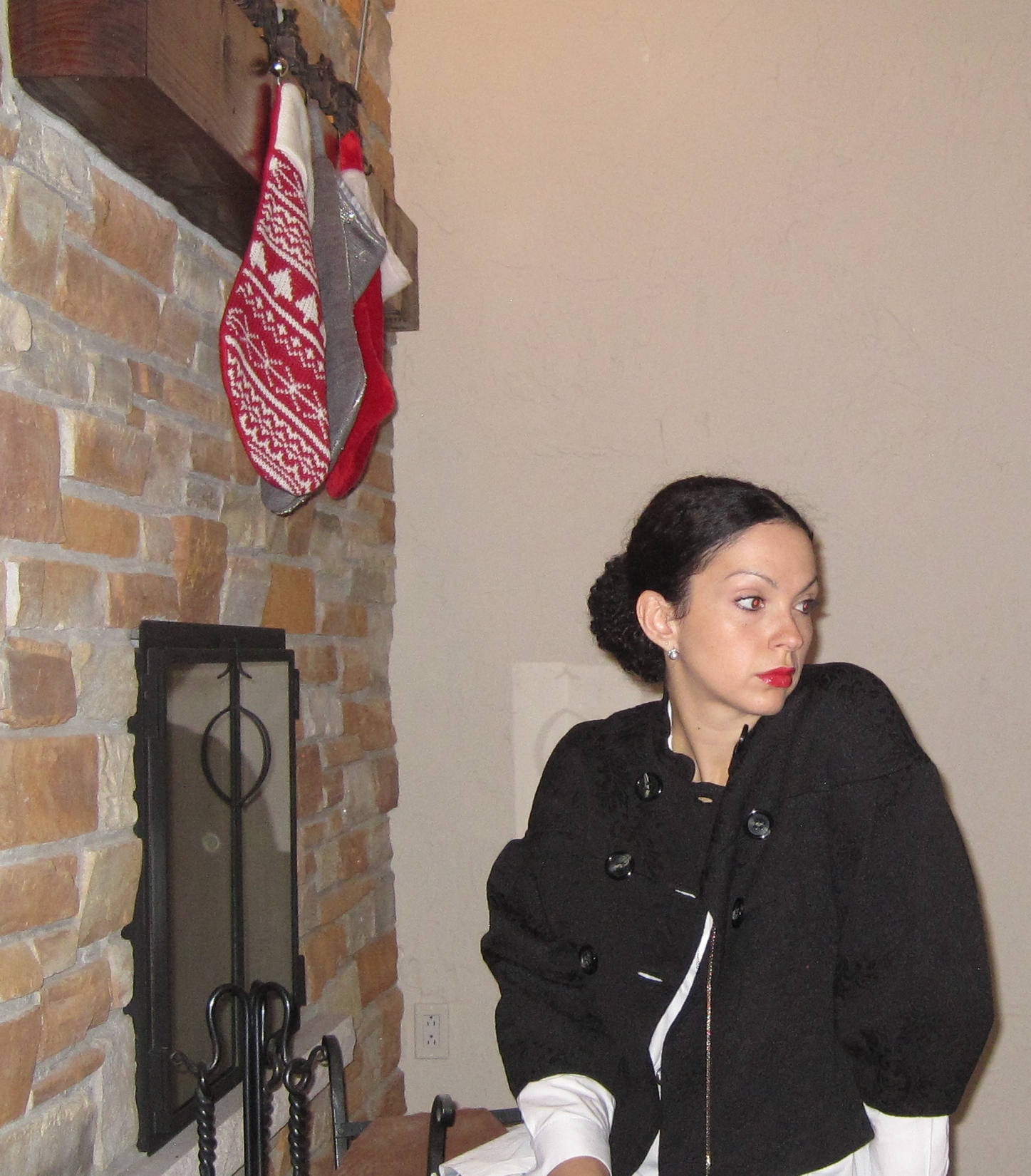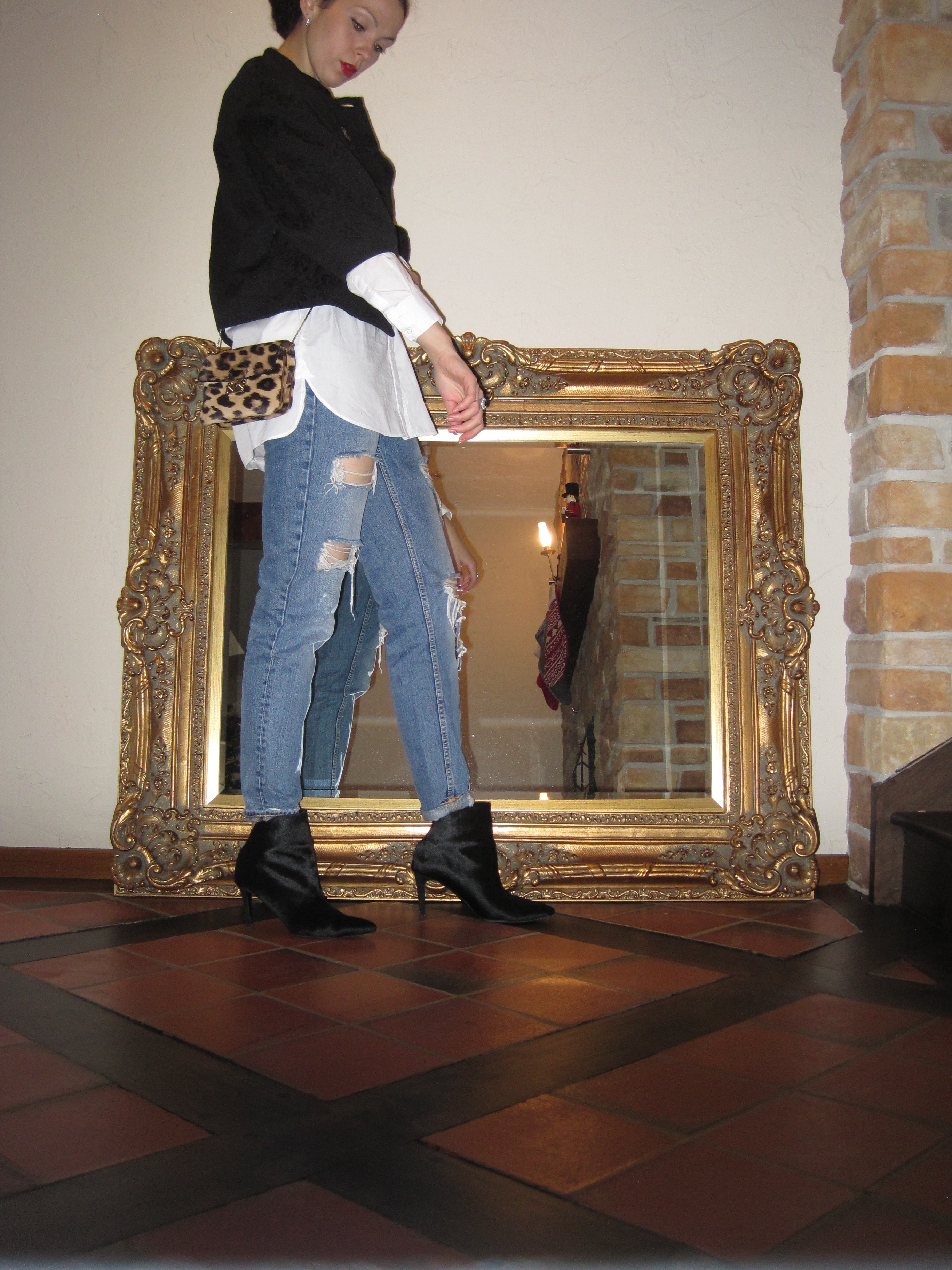 So amidst the holiday shopping and decorating, I wanted to share an easy chic outfit perfect for running around or meeting up with friends for a holiday egg nog(with rum). I find two of the easiest pieces to pair together is a classic white shirt and some denim bottoms. It’s safe if you don’t want to be too casual or too dressed up, and it gives a really chic look no matter where you’re off to that day. With just the change of accessories you can switch it up from day to night. I’m wearing some ripped denim here for an edgier look but give it some chicness with these black pointed booties, damask textured evening jacket, and more elegant accessories. You can switch these up for a chunky cardigan and some hightop sneakers(which is what I always have on my feet when running around with my little one.) and then you have a more laid back casual look. I also love the men-sy fit of this white shirt. I find a certain sexiness of a more straight cut looser feel and I love the little shirttail on the back. It’s less-tailored construction gives a more comfortable fit for day and a cool-girl feel for night. The white shirt is versatile, chic, and looks like you have everything together, even if you don’t feel that way sometimes 🙂
