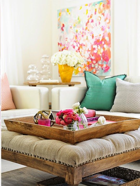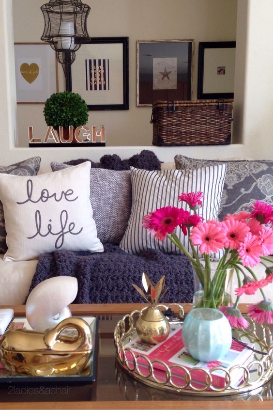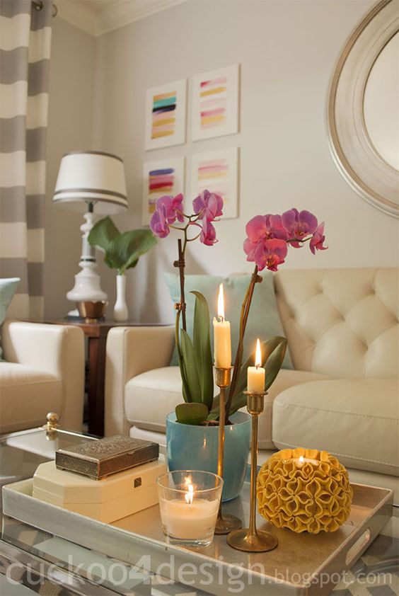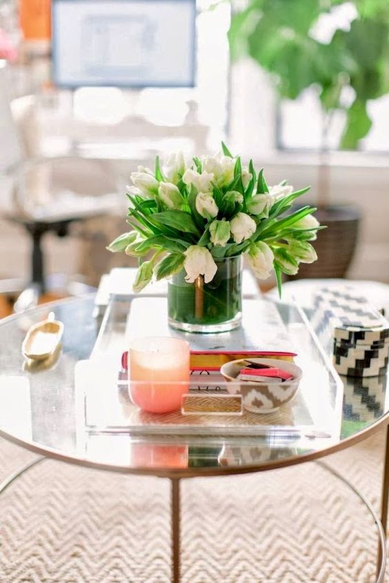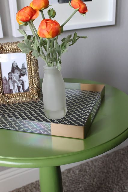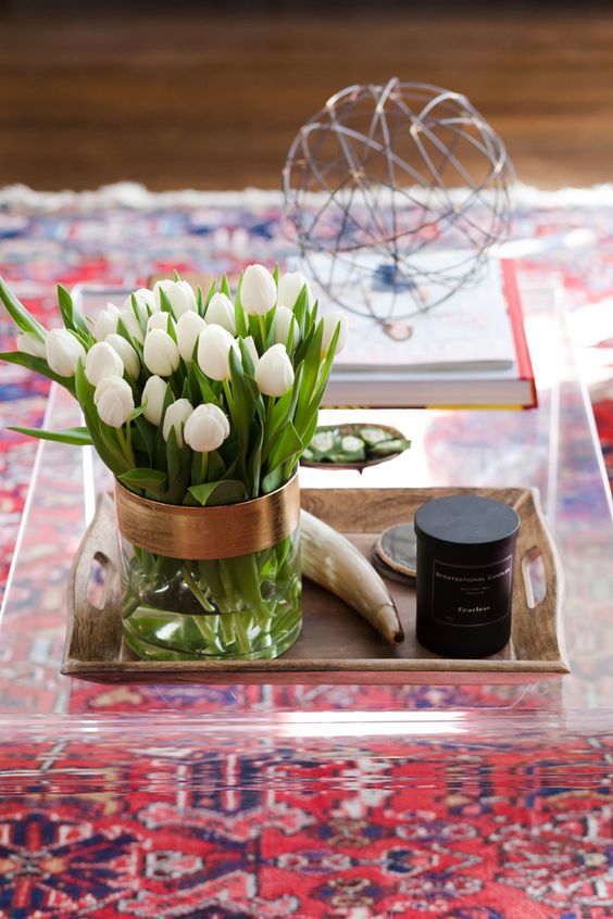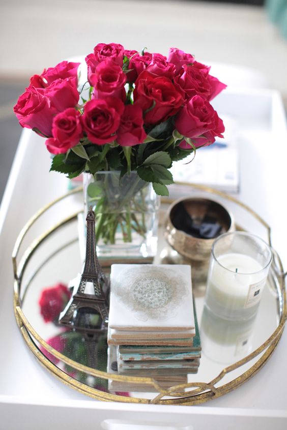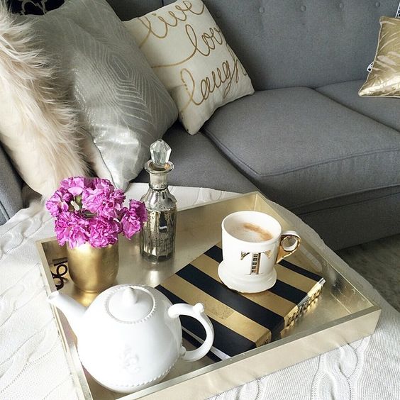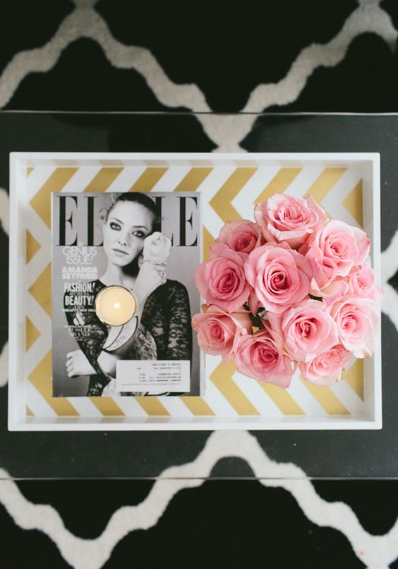 So amidst my home decorating right now, I’m trying to find a way to add some modern touches to some antique furniture pieces right now. We’re upholstering a vintage sofa set and some armchairs and I’m thinking I’ll have to add some splashes of modernness to avoid it getting too heavy. We have a lot of wood and brick in our home so it needs some light airiness in the little pieces of decor we’ll add. I think a cool way is to use some modern lamps or tray decor to our coffee tables and living area. What better way than with some tres cool trays and fresh flowers. Here are some ideas I came across in my pinterest and home-mag research for some great tray decor.