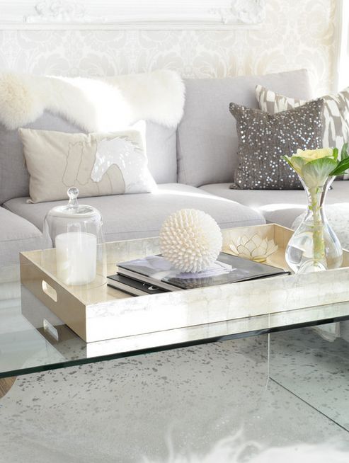 - Most importantly choose a good tray! lol Do you want something mirrored or Lucite (which is what I think I’m leaning towards with my living room in progress.) Or maybe something vintage and wooden, or a cool rustic metal & wood combo, or even something with a printed centre so It pops in a neutral living room. The best way to decide is to scroll through some pics and see what makes you feel excited to decorate and which one will pop or blend with your decor(whichever you’d like to achieve)…and that’s usually the one. I’ve been stuck on something bright or clear for a while and I think that’s what I’ll go with once my sofas are ready. Since my sofa and chairs have ornate wood around them, I’ll stick to a simple rectangular or oval shape tray with a clean border, nothing with major carving or ornate embellishment since I’ve already got a lot of that going on in the space. I’m sticking to a modern edge for this one. If you have very clean cut lines in your living space, maybe a more ornate tray would work for you…. See what I did there? lol..Opposites attract. Don’t be afraid to mix it up.